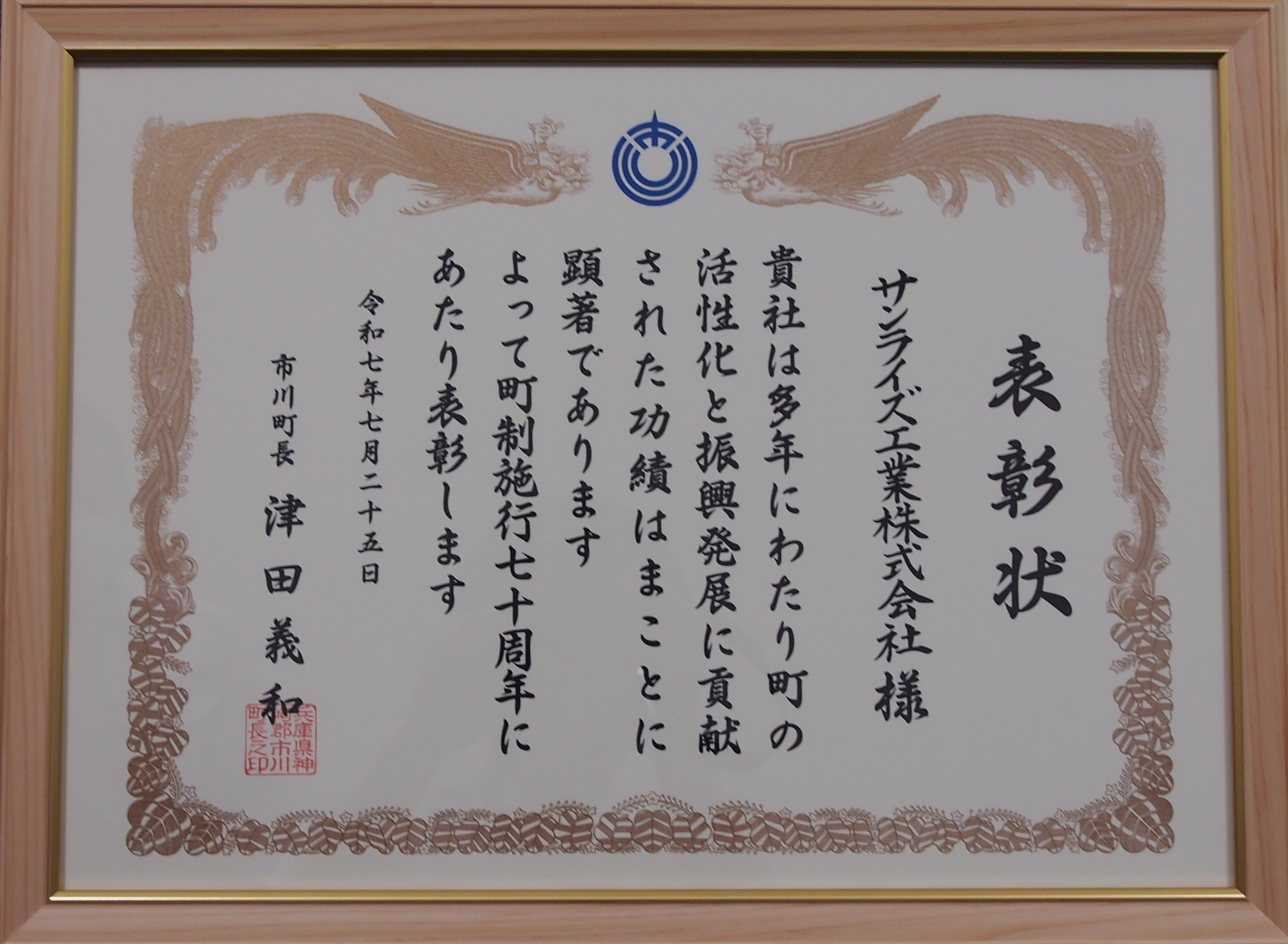 市川町施行70周年記念の節目にあたり、市川町長 津田義和様より善行表彰を賜りました。